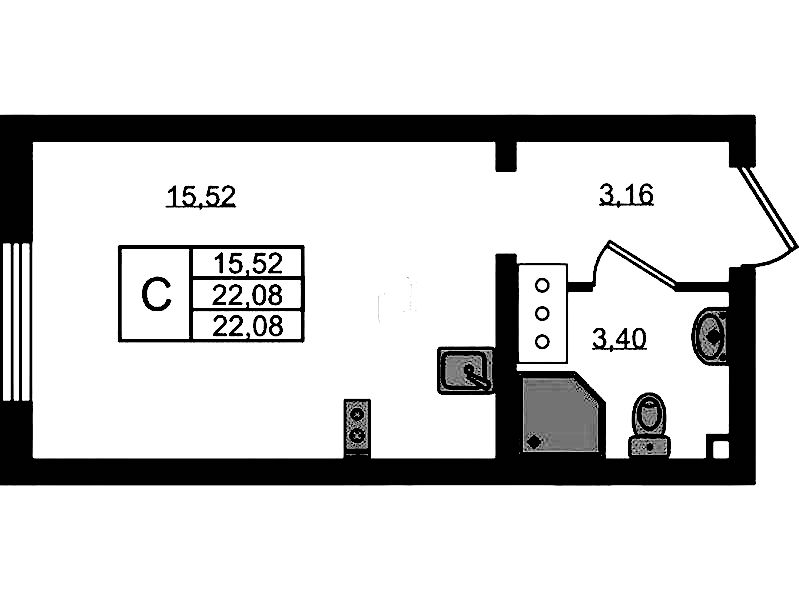 Квартира-студия на 9-ом этаже 22,08 кв.м