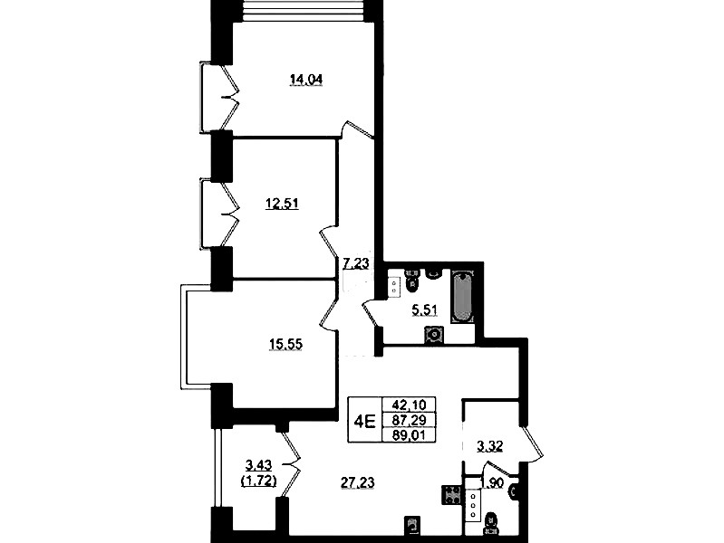 Трёхкомнатная квартира на 11-ом этаже 89,01 кв.м