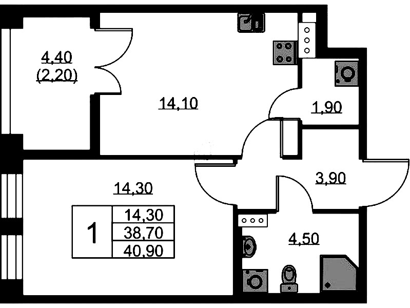 Однокомнатная квартира на 8-ом этаже 40,9 кв.м