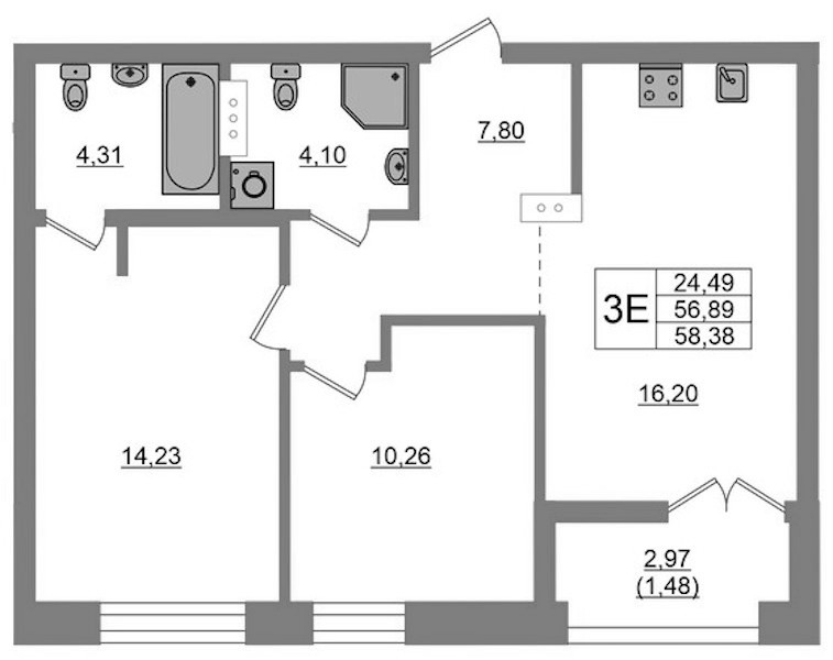 Двухкомнатная квартира на 5-ом этаже 58,38 кв.м