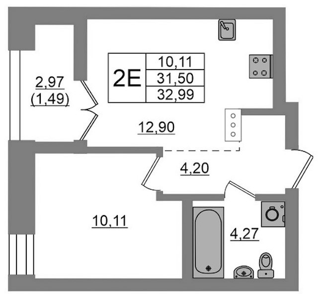 Однокомнатная квартира на 6-ом этаже 32,99 кв.м