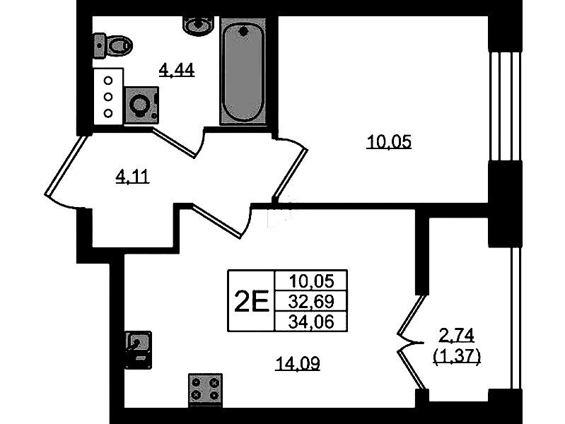 Однокомнатная квартира на 9-ом этаже 34,06 кв.м