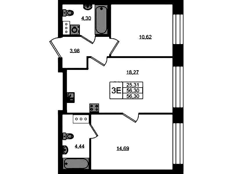 Двухкомнатная квартира на 3-ем этаже 56,3 кв.м