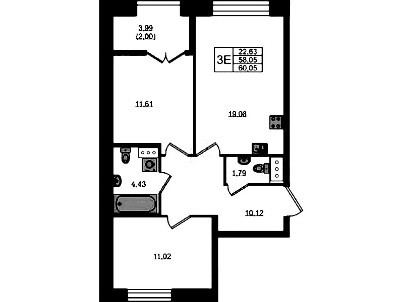 Двухкомнатная квартира на 7-ом этаже 60,05 кв.м