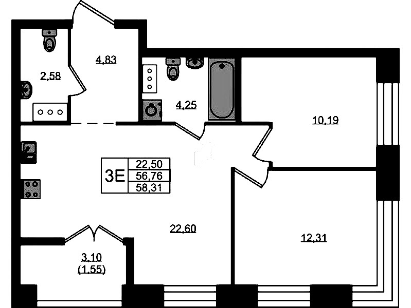 Двухкомнатная квартира на 4-ом этаже 58,31 кв.м