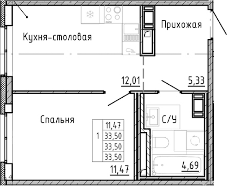 • Площадь33,5 м2