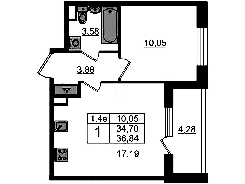 Однокомнатная квартира на 1-ом этаже 34,7 кв.м