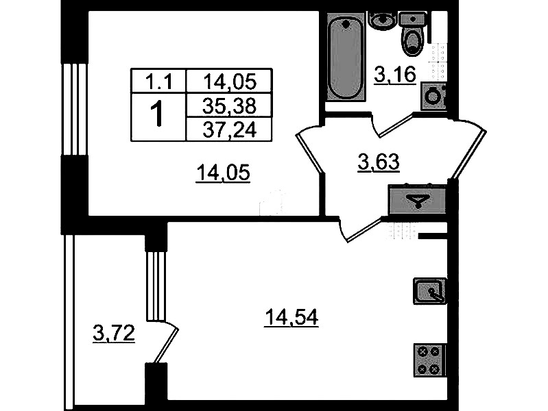 Однокомнатная квартира на 5-ом этаже 35,38 кв.м