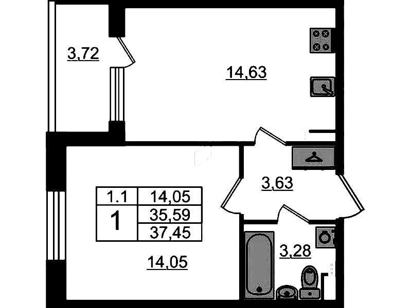 Однокомнатная квартира на 2-ом этаже 35,59 кв.м