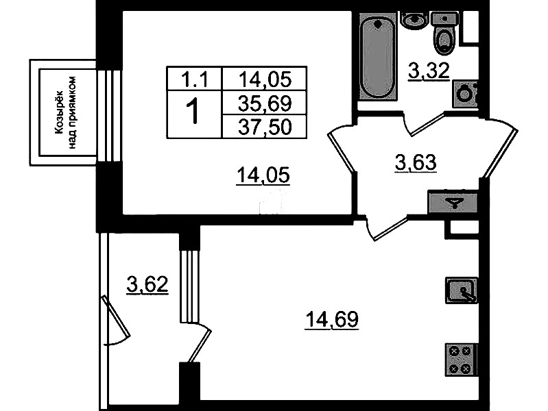 Однокомнатная квартира на 1-ом этаже 35,69 кв.м