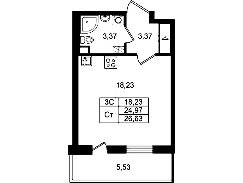 Квартира-студия на 4-ом этаже 24,97 кв.м
