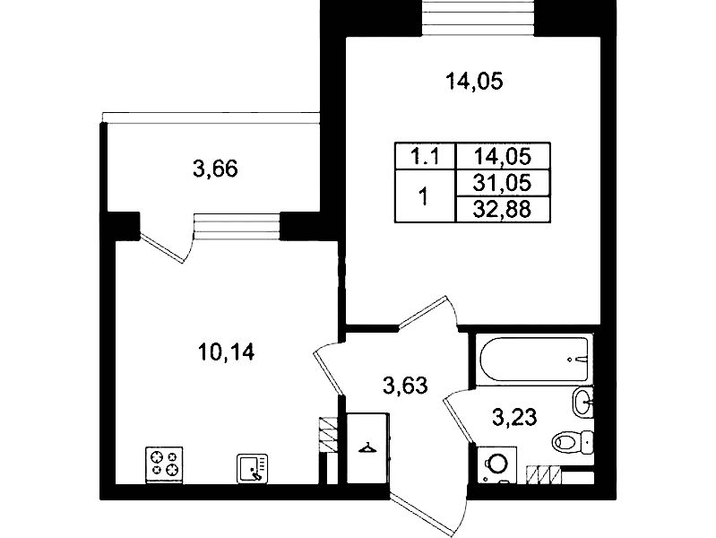 Однокомнатная квартира на 5-ом этаже 31,05 кв.м