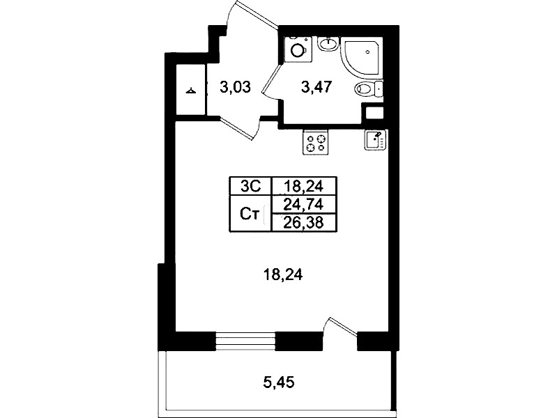 Квартира-студия на 2-ом этаже 24,74 кв.м