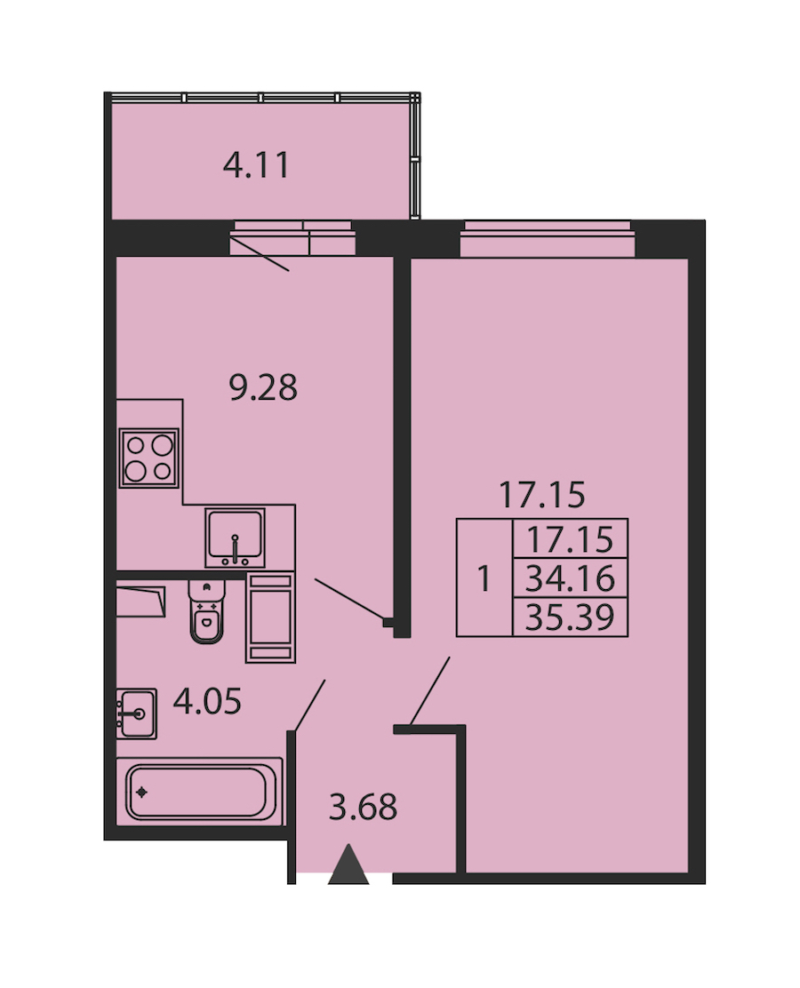 Однокомнатная квартира на 2-ом этаже 34,16 кв.м