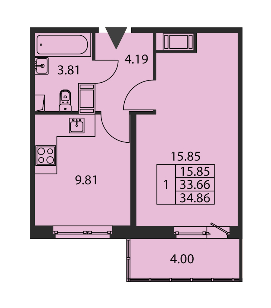 Однокомнатная квартира на 7-ом этаже 33,66 кв.м