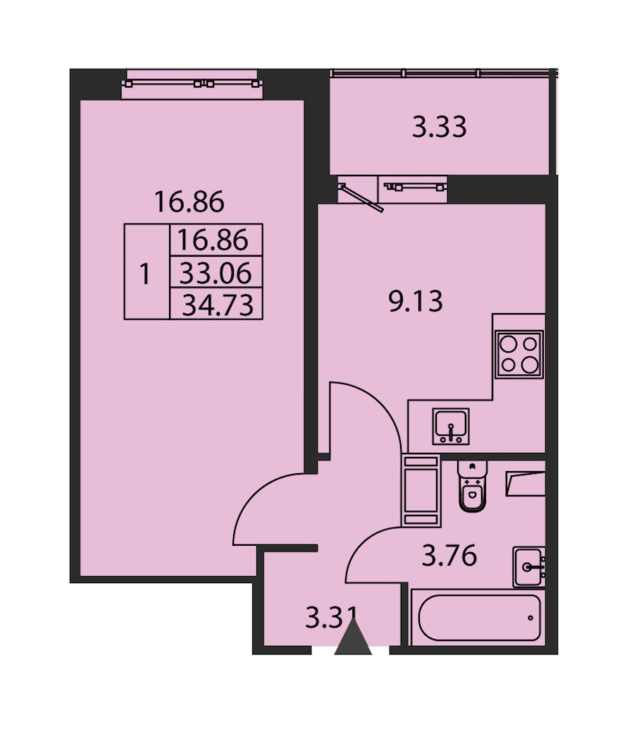 Однокомнатная квартира на 12-ом этаже 33,06 кв.м