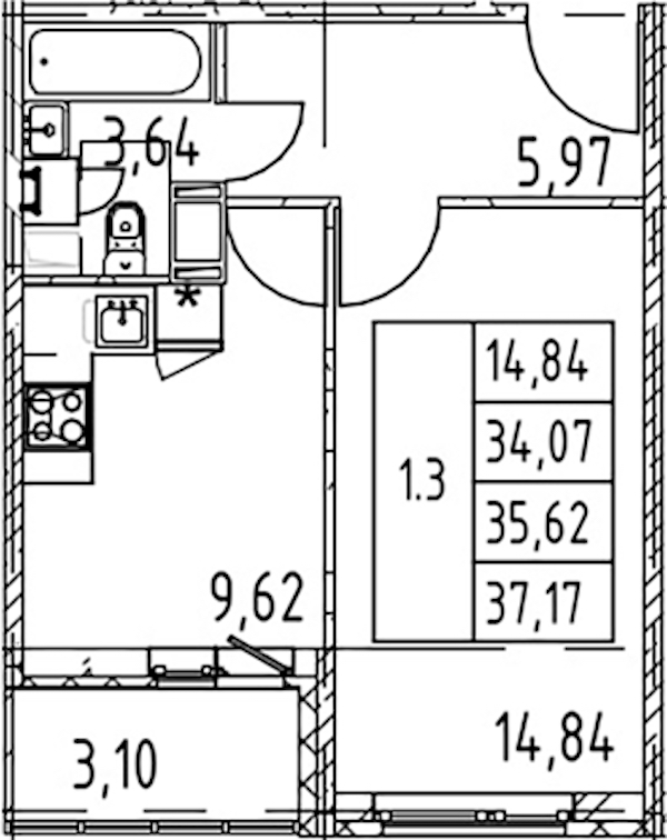 Однокомнатная квартира на 11-ом этаже 34,07 кв.м