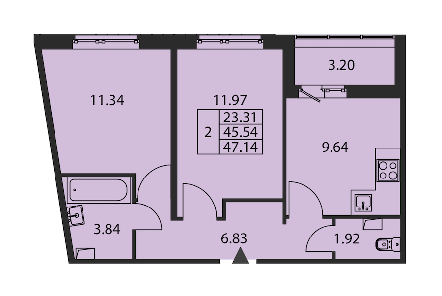 Двухкомнатная квартира на 1-ом этаже 45,54 кв.м