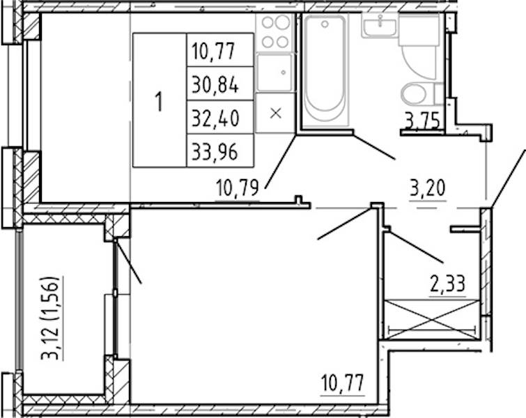 Однокомнатная квартира на 9-ом этаже 30,84 кв.м