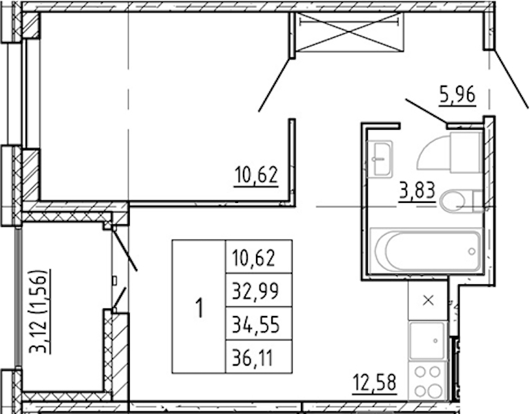Однокомнатная квартира на 6-ом этаже 32,99 кв.м