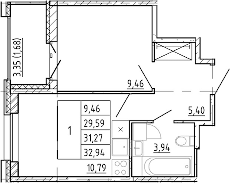 Однокомнатная квартира на 12-ом этаже 29,59 кв.м