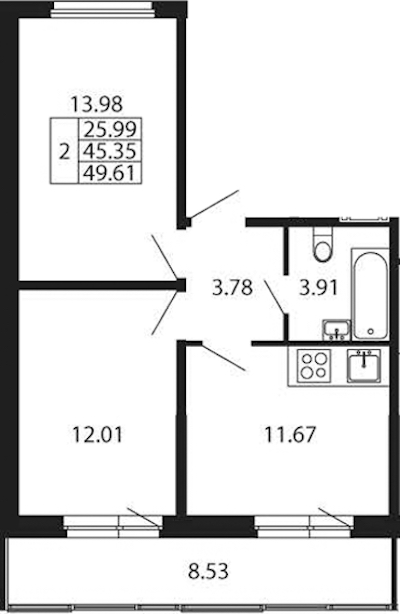 Двухкомнатная квартира на 8-ом этаже 45,35 кв.м