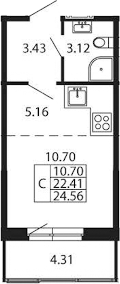 Квартира-студия на 6-ом этаже 22,41 кв.м