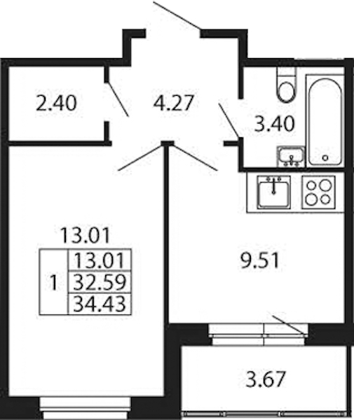 • Площадь кухни9,51 м2