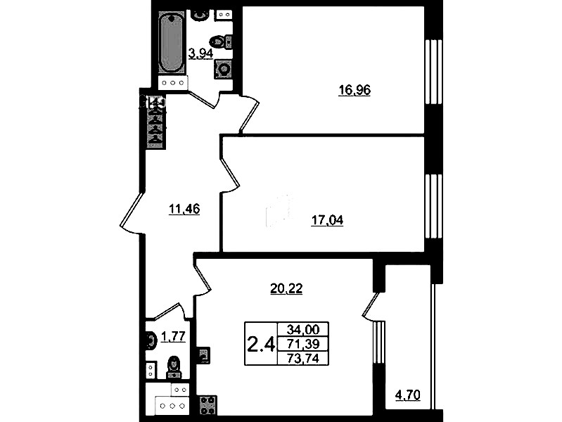 Двухкомнатная квартира на 2-ом этаже 71,39 кв.м