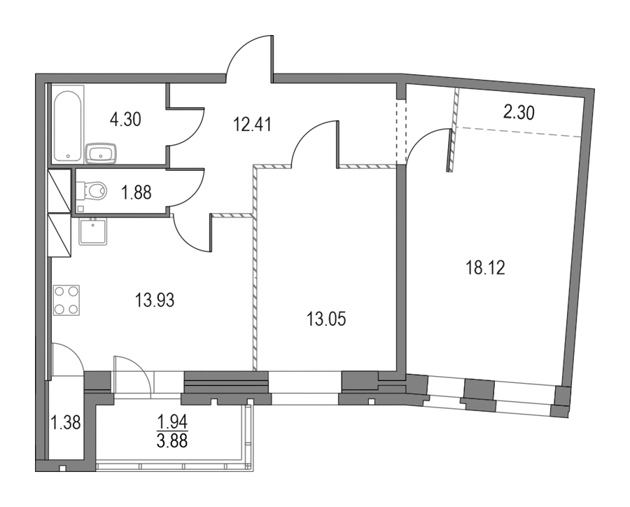 Двухкомнатная квартира на 11-ом этаже 65,99 кв.м