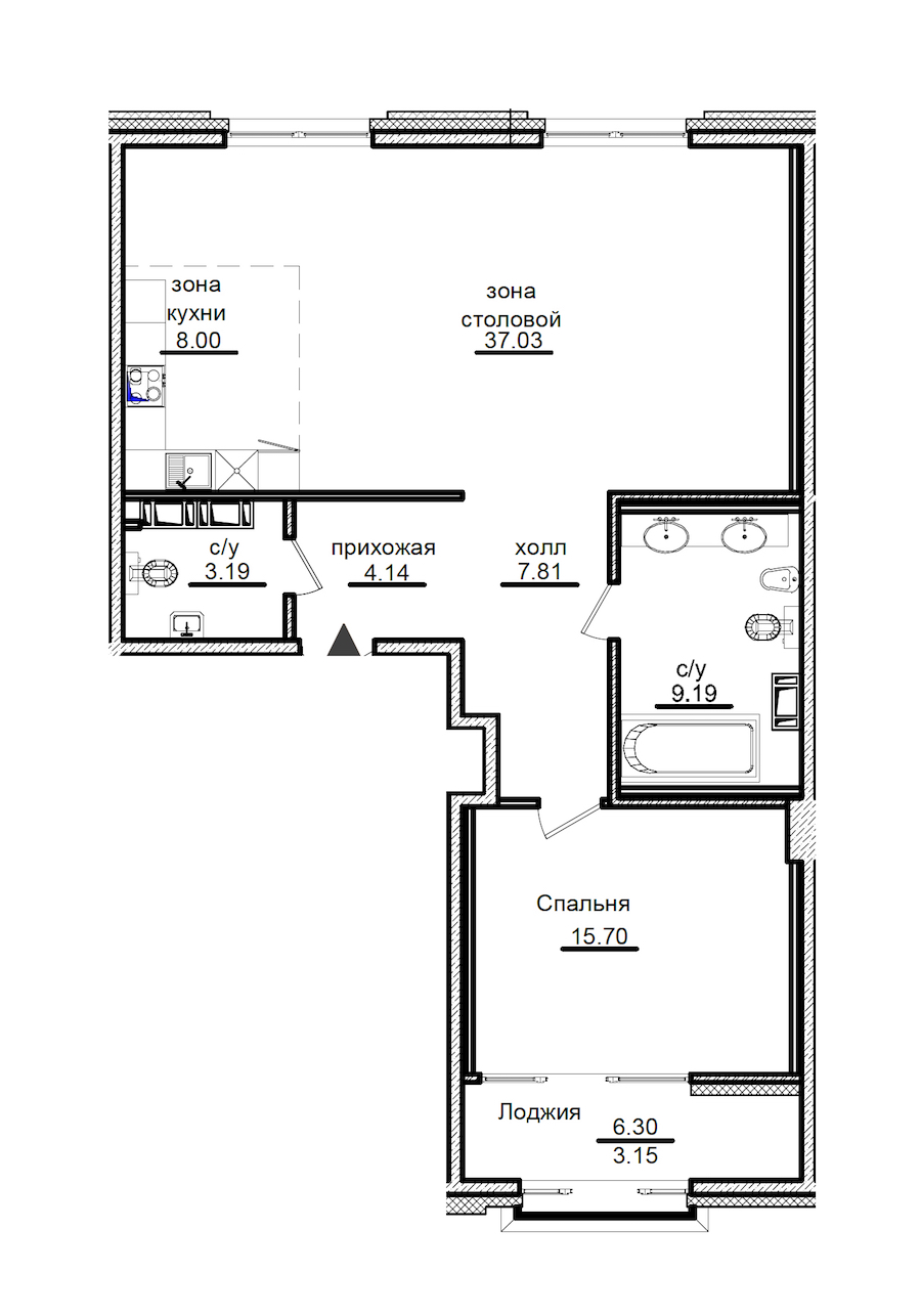 Однокомнатная квартира на 6-ом этаже 88,21 кв.м