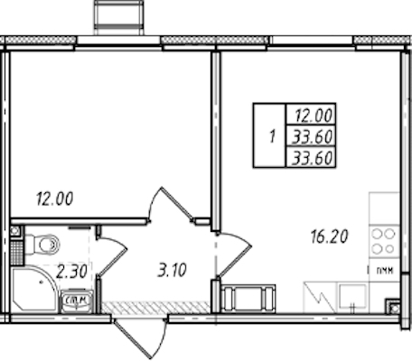 • Площадь33,6 м2