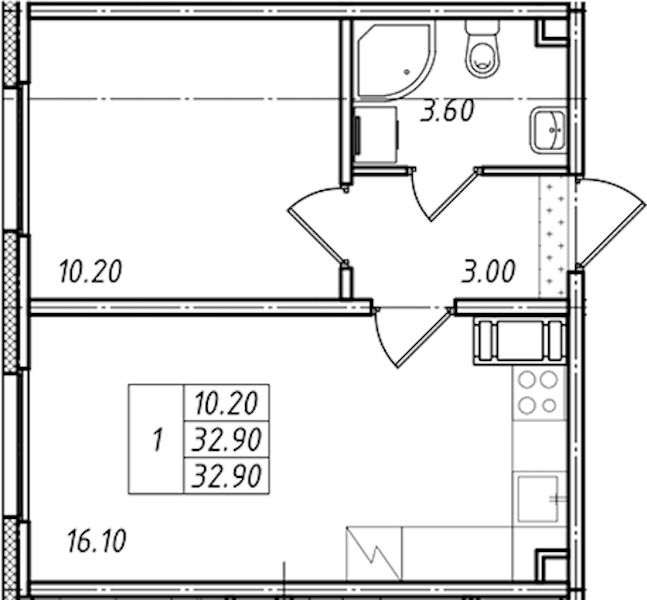 Однокомнатная квартира на 15-ом этаже 32,9 кв.м