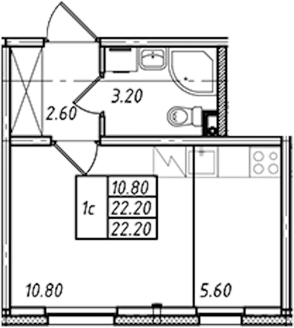 Квартира-студия на 6-ом этаже 22,2 кв.м