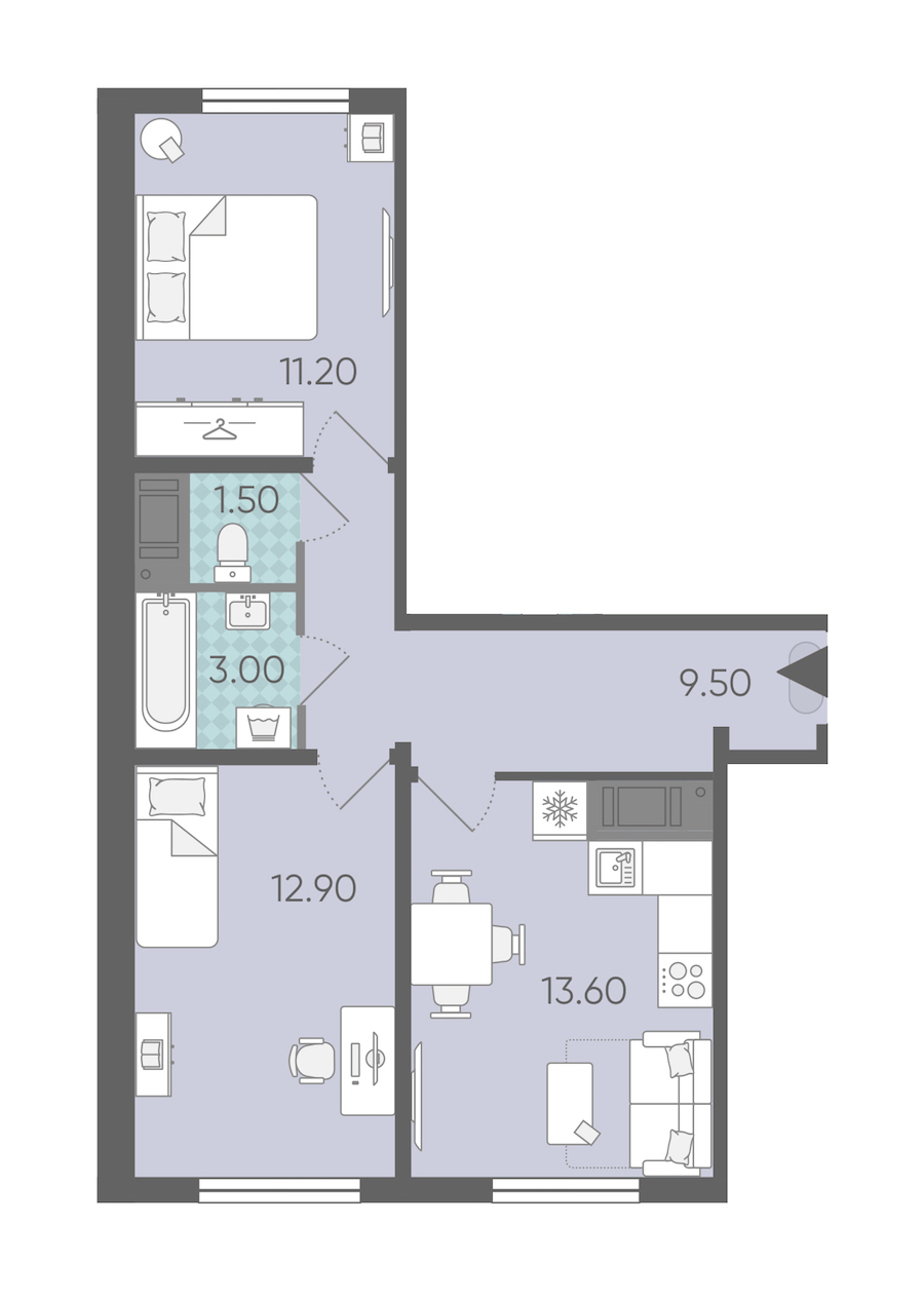Двухкомнатная квартира на 8-ом этаже 51,7 кв.м