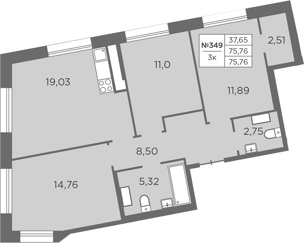 Трёхкомнатная квартира на 6-ом этаже 75,76 кв.м