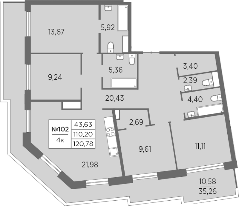 Четырёхкомнатная квартира на 7-ом этаже 120,78 кв.м