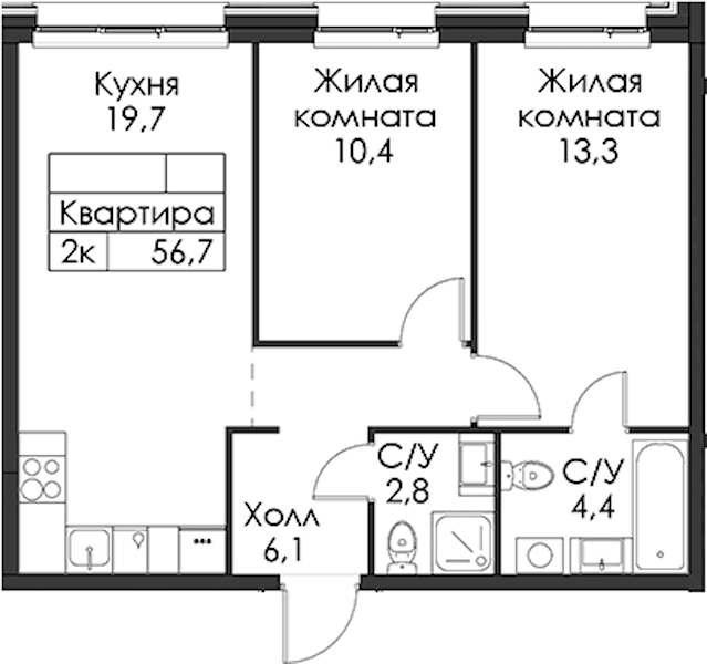 Двухкомнатная квартира на 8-ом этаже 56,7 кв.м