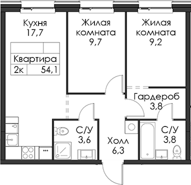 Двухкомнатная квартира на 11-ом этаже 54,1 кв.м