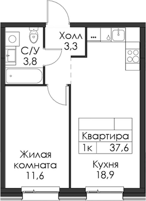 Однокомнатная квартира на 3-ем этаже 37,6 кв.м