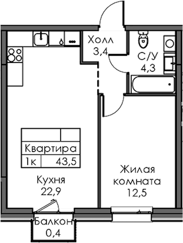 • Площадь43,5 м2