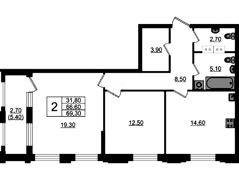 Двухкомнатная квартира на 10-ом этаже 69,3 кв.м