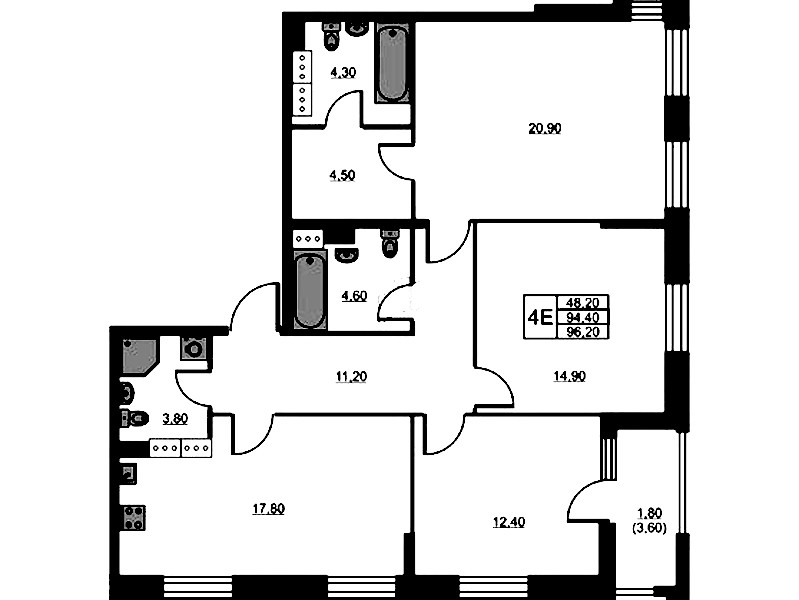 Трёхкомнатная квартира на 12-ом этаже 96,2 кв.м