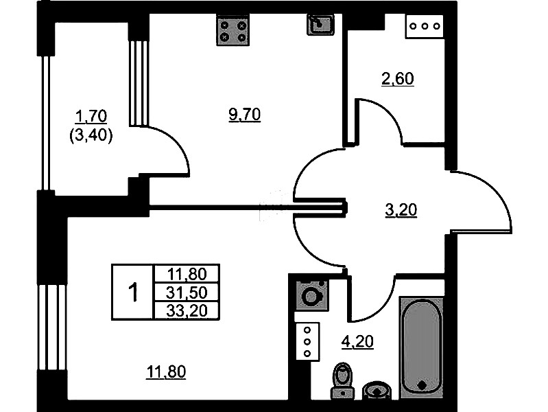 Однокомнатная квартира на 11-ом этаже 33,2 кв.м
