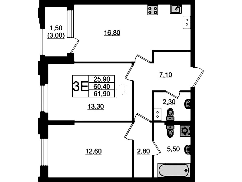 Двухкомнатная квартира на 9-ом этаже 61,9 кв.м