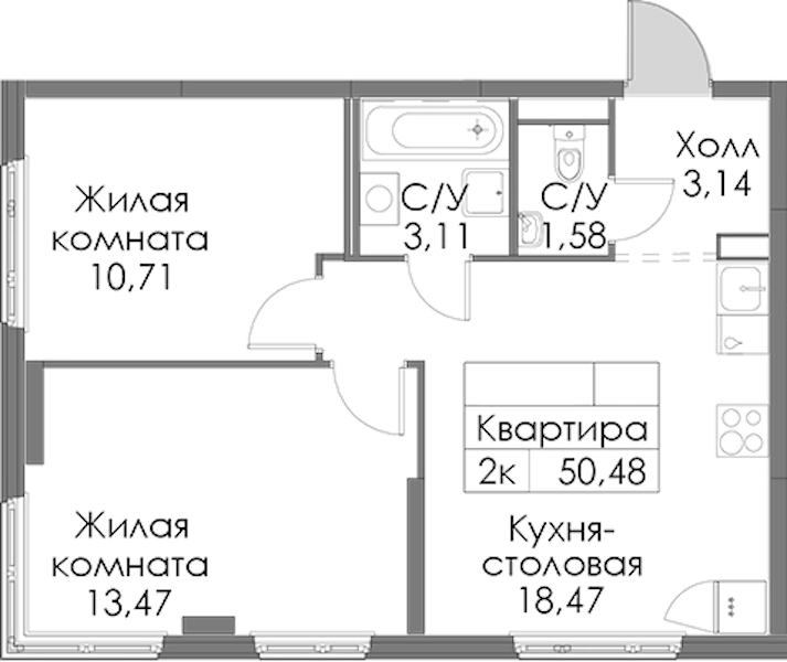 Двухкомнатная квартира на 11-ом этаже 50,48 кв.м