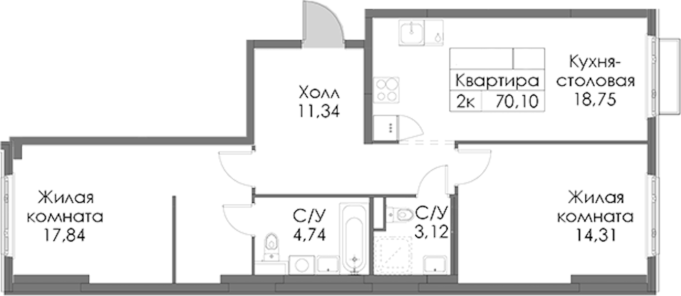 Двухкомнатная квартира на 6-ом этаже 70,1 кв.м