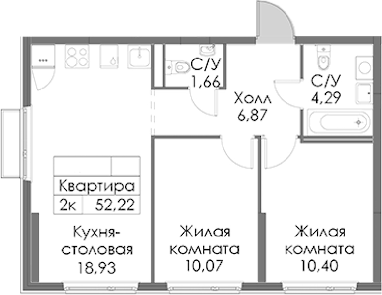 Двухкомнатная квартира на 10-ом этаже 52,22 кв.м