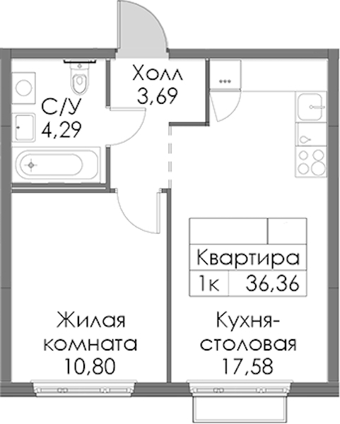 Однокомнатная квартира на 2-ом этаже 36,36 кв.м