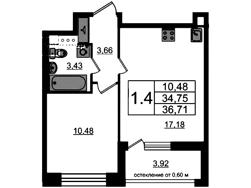 - Площадь кухни17,18 м2